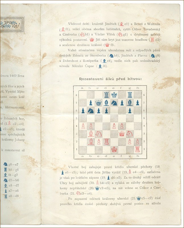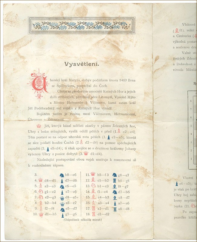 (Dobrusky, Jan): Vysvetleni Partie sachove provedene se zivymi figurami peci Druzstva ku vystaveni telocvicny Sokola Staromestskeho za spolupusobeni clenu Jednot Sokolskych z Prahy a okoli a clenu Ces.[keho] spolku sachovniho v Praze na Sportovnim Zavodisti v Bubnech. 1897. 23., 27. a 30. květen.