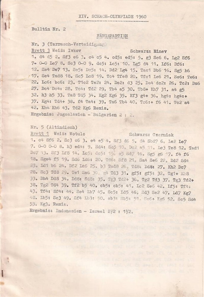 Leipzig 1960. XIV. Schach - Olympiade Leipzig 1960. 1600 games from the tournament without annotations. No diagrams. Bulletin Nr. 1 - 22. 206 unnumbered leaves. 30 cm. Typescript printed recto and verso. Paper cover. USSR won in front of USA. S.l. Leipzig 1960.