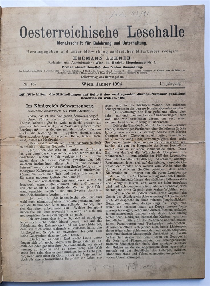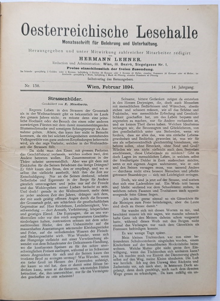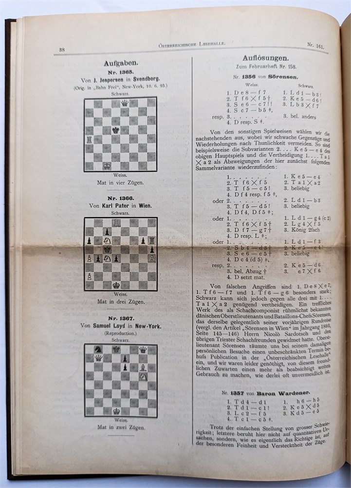 Oesterreichische Lesehalle. Monatsschrift für Unterhaltung und Belehrung. Herausgegeben und unter Mitwirkung zahlreicher Mitarbeiter redigirt von Hermann Lehner. Wien, self-edition, 1894. In German. Title page, index, issues 1-12 (Nos. 157-168), 96 pages. Complete volume 14. Covers not issued. LN 5955. Di Felice 1721. Kieler Schachkatalog 183.