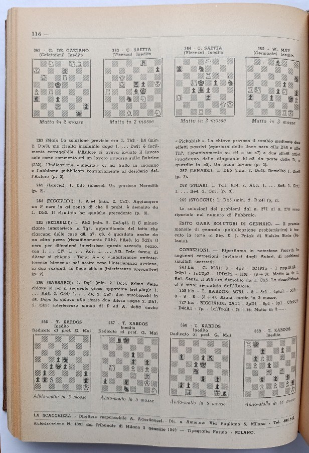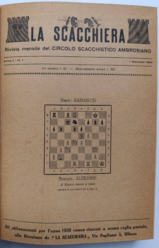 La Scacchiera was an Italian chess monthly that was published from January 1949 to May 1956. It covered both practical chess and chess composition. In this auction, I am offering a complete run of this quite rare magazine.