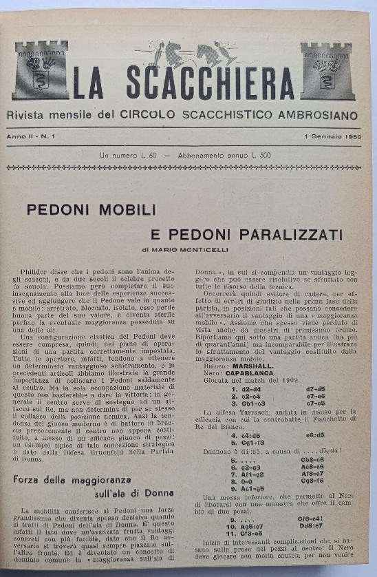 La Scacchiera 1950-1952. Rivista mensile del Circolo Scacchistico Ambrosiano. Monthly. In Italian. Editor and Publisher Ariodante Agostinucci. Milano, 1950-1952. Volumes 2-4. LN 6190. Sanvito 906. New Sanvito 3108. Di Felice 2147.