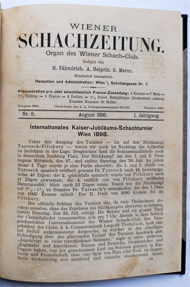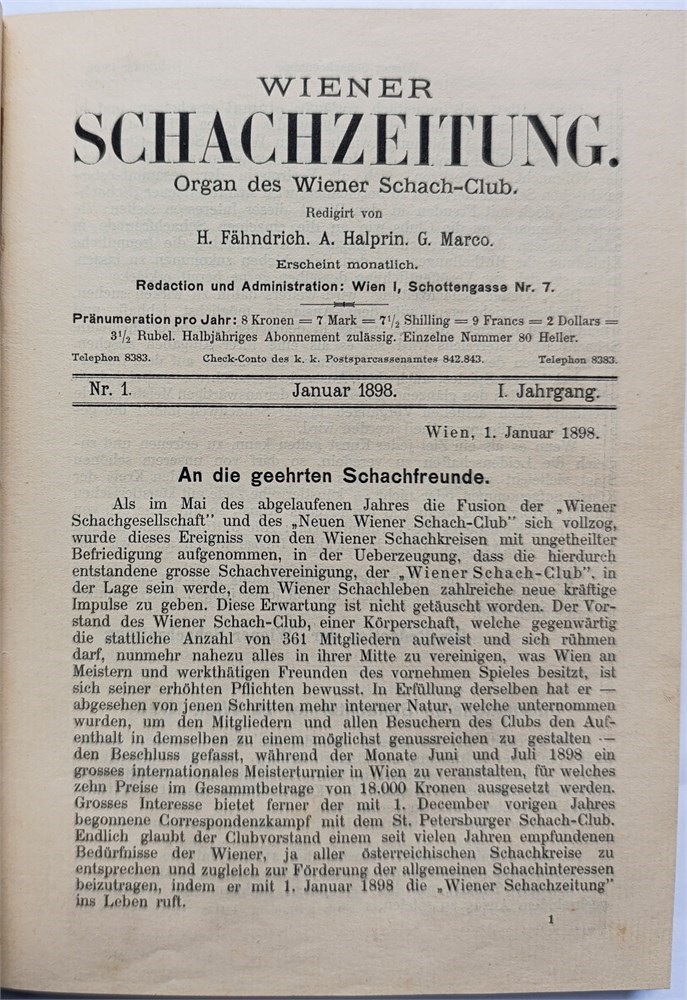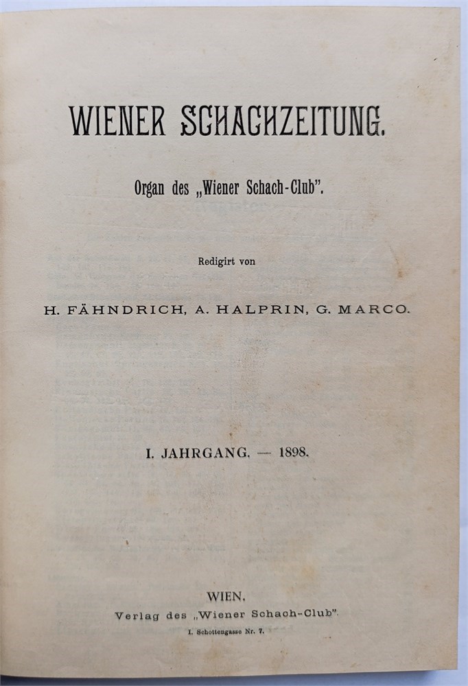 Wiener Schachzeitung 1898. Organ des “Wiener Schach-Club”. Monthly. In German. Editors: M. Fändrich, A. Halprin, G. Marco. Issues 1-12. Half-title, title, index (VII), 204 pages. Volume 1. Covers not bound. LN 5957. Di Felice 2793.