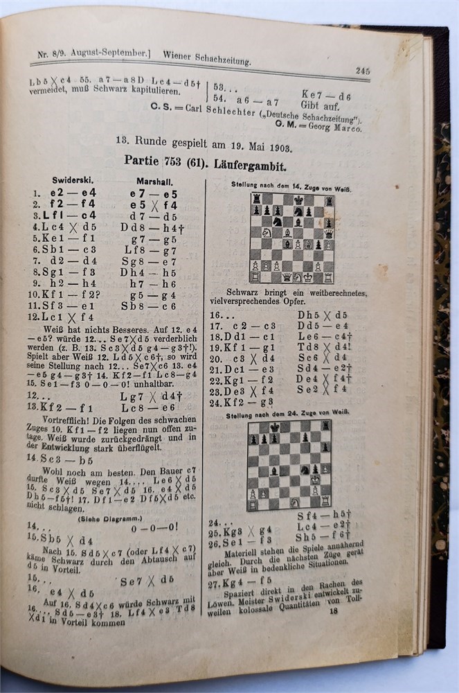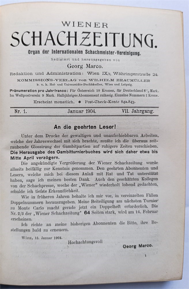 Wiener Schachzeitung 1904. Organ der Internationalen Schachmeister-Vereinigung. Monthly. In German. Editor: Georg Marco. Issues 1-12 (2/3, 4/5, 8/9 and 10/11 are double issues). Title page, index (VIII), 380 pages. Volume 7. Covers not bound. LN 5957. Di Felice 2793.