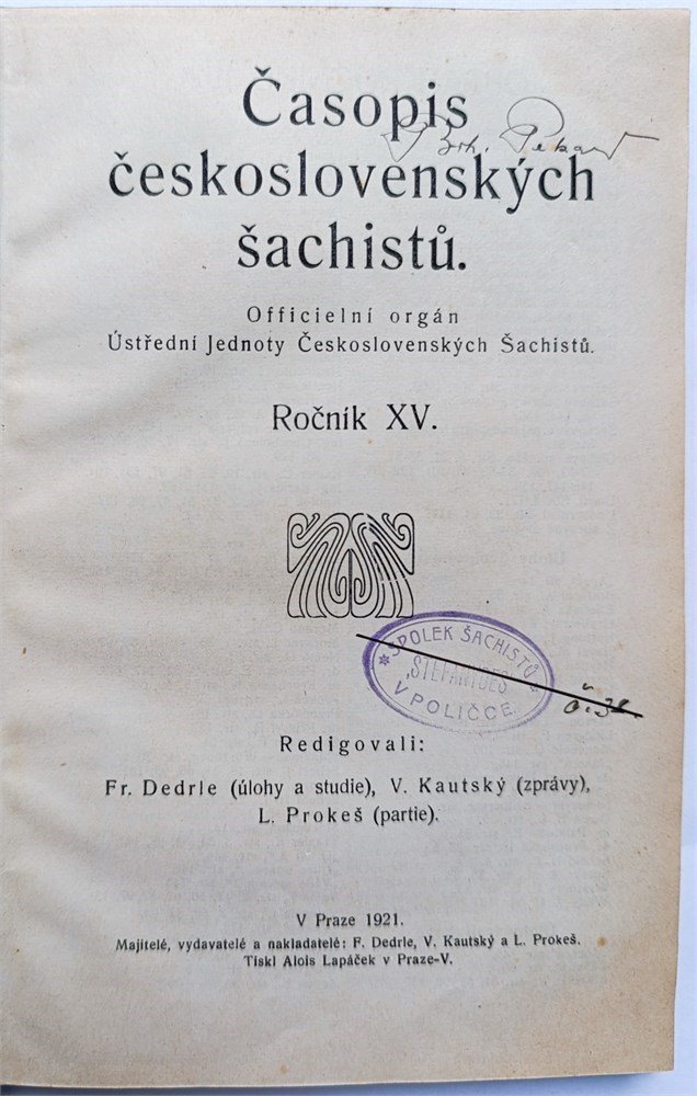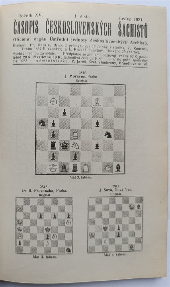 Casopis ceskoslovenskych sachistu 1921. Oficielni organ Ustredni jednoty ceskoslovenskych sachistu. Praha. Editors: Frantisek Dedrle, Vaclav Kautsky, Ladislav Prokes. Monthly. In Czech. Title page, index, 172 pages. Issues 1-12 (6/7 and 8/9 are double issue). Volume 15. Covers not bound. LN 5985. Soukup 5. Mokry 238. Di Felice 443.