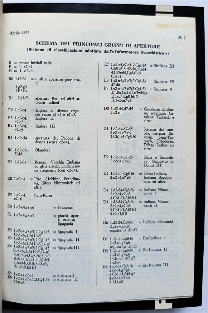Rivista di Scacchi 1973-1974. Monthly. In Italian. Editor: Riccardo Magrini. Milano, 1973-1974. Issues 1-12. Volumes 1-2 (all published). Sanvito 902. New Sanvito 3101. Di Felice 2012.