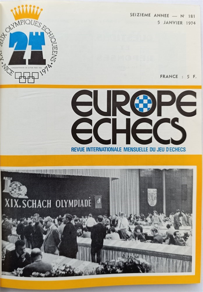 Europe Echecs 1974. Revue Internationale Mensuelle du Jeu d'Échecs. Monthly. In French. Issues 1-12 (181-192). 292 pages. Volume 16. All covers bound in (included in the pagination).Title page and index not issued. Di Felice 941.