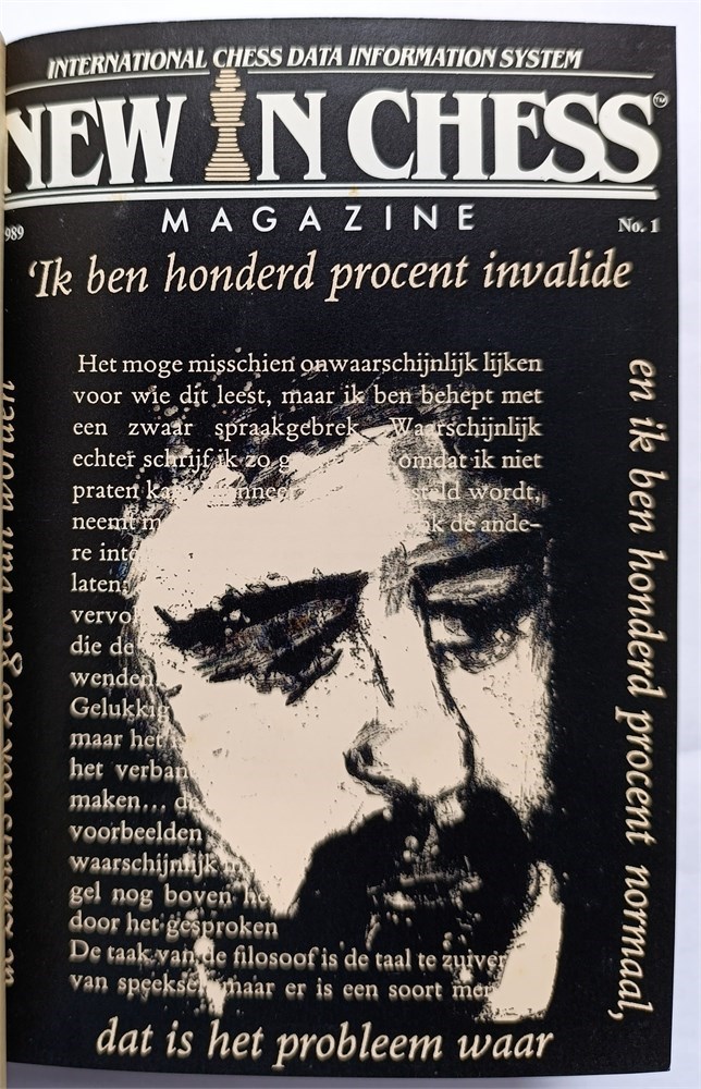 New in Chess 1989. Interchess BV, Alkemaar, 1989. Editor in chief: Jan Timman. In English. Issues 1-8. Each issue with 98 pages. Volume 6. Title page and index not issued. All covers bound in. Lusis A411. Di Felice 1613. Weight 1,4 kg.