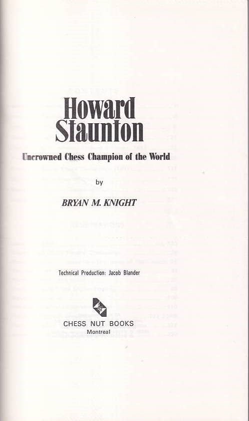 Howard Staunton: Uncrowned Chess Champion of the World by Bryan M. Knight is a reassessment of the life and legacy of Howard Staunton, arguing that he was effectively the world’s strongest player during the 1840s despite never holding an official championship title. Knight portrays Staunton as a dominant competitor and a pivotal figure in Victorian chess, combining biography with Staunton’s own writings and contemporary sources.