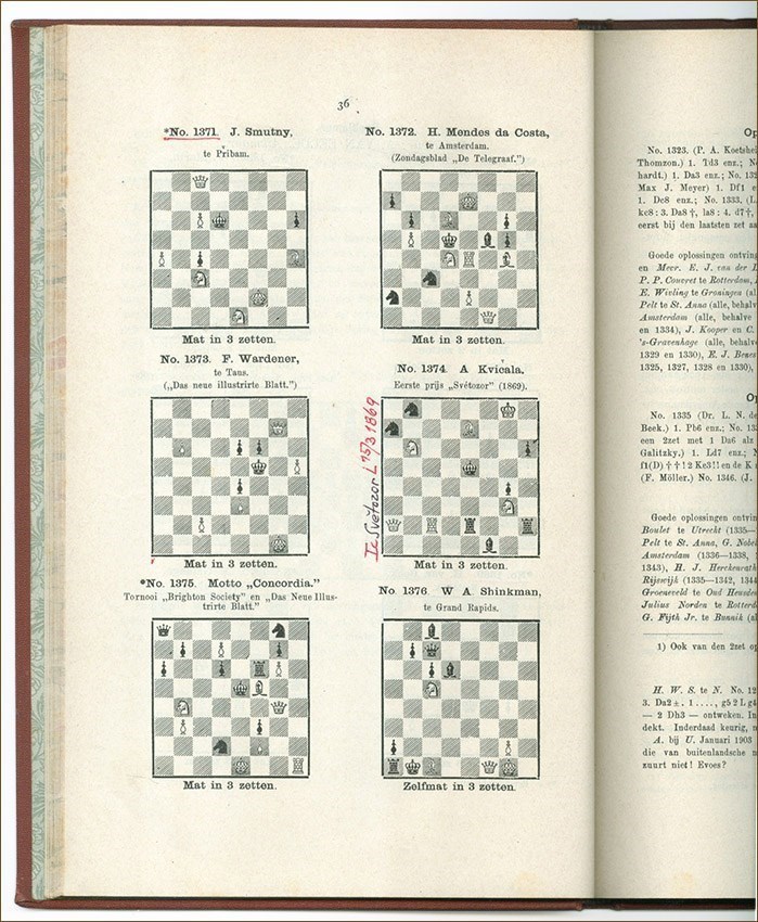 Good plus: binding is tight. Edges and corners slightly rubbed. Stamp of previous owner on the front paste-down (= chess composer and collector Ilja Mikan) is overlaid with a blank paper sticker. Internally OK, pages are clean. There are occasional neat annotations in pen or crayon in the problem section in Mikan's hand.