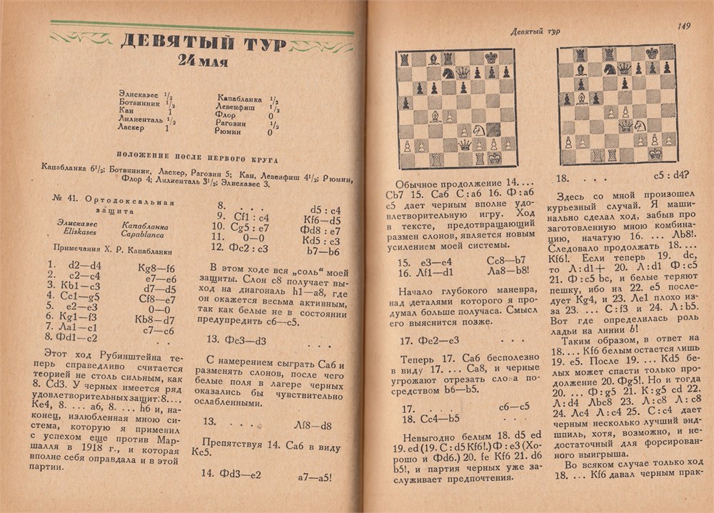 90 games annotated from the tourrnament. 1) Capablanca 13/18; 2) Botvinnik 12; 3) Flohr 9½; 4) Lilienthal 9. .Several photos.