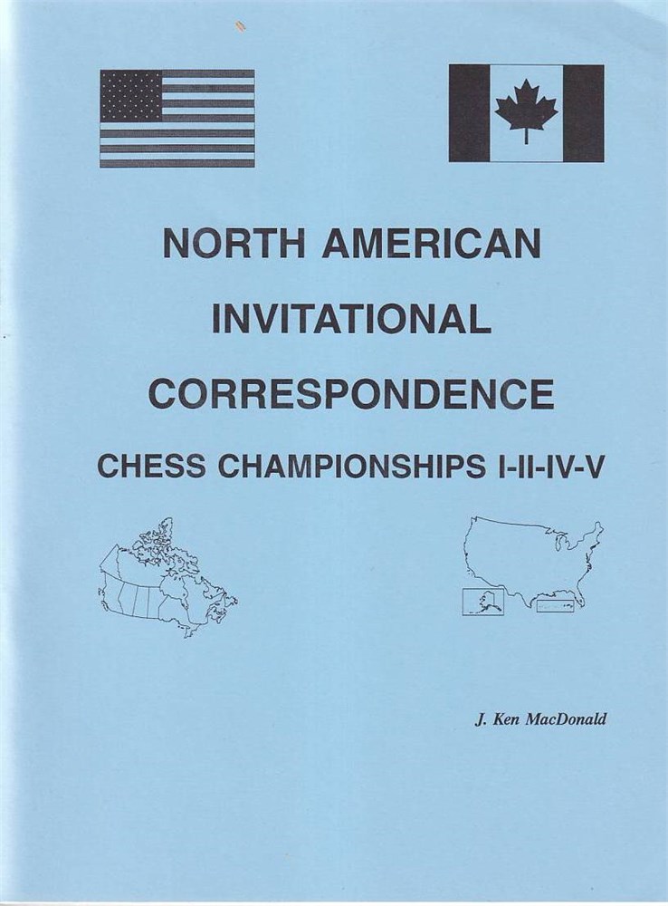 North American Invitational Correspondence Chess Championships I–II–IV–V, compiled by J. Ken MacDonald and published by the Canadian Correspondence Chess Association in 1995. It collects correspondence chess games from four editions of the North American Invitational Correspondence Chess Championships — specifically the 1st, 2nd, 4th, and 5th events — and presents them with scores and likely some annotations, crosstables, and commentary typical of tournament collections. The book runs 92 pages (plus cover and front matter) and includes almost 300 games overall, preserving important historical play by top U.S., Canadian, and other North American correspondence players from those events.