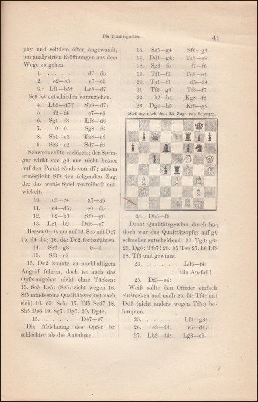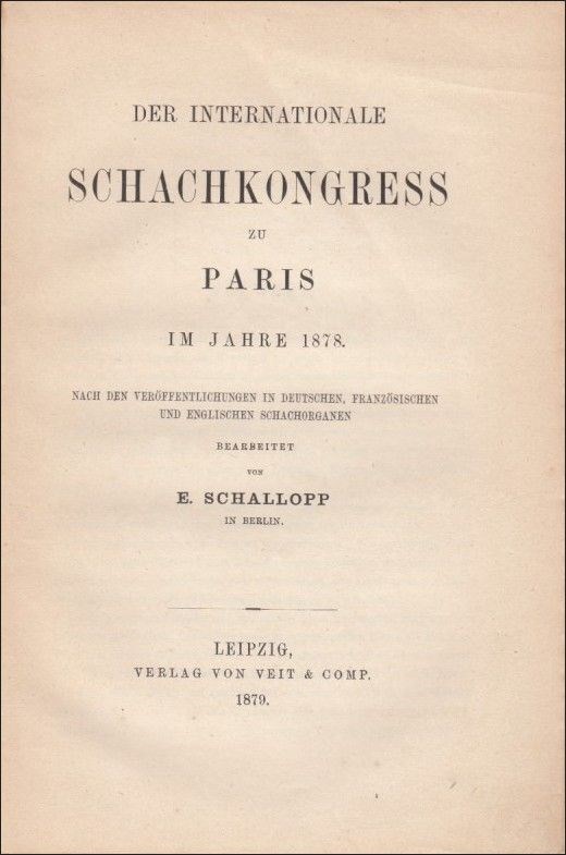 Paris 1878. Der internationale Schachkongress zu Paris im Jahre 1878. Nach den Veröffentlichungen in deutschen, französischen und Englishen Schachorganen. 119 games (of 132) with annotations in German. Some diagrams. Algebraic notaion. Cross table. Opening index. Problem tournament and solutions. Zukertort and Winawer won. VI, 1 leaf, 175 pages. 21 cm. Paperback with thin green paper cover. Leipzig, Veit, 1879. L/N 5208.