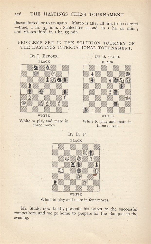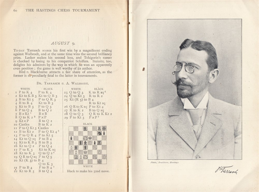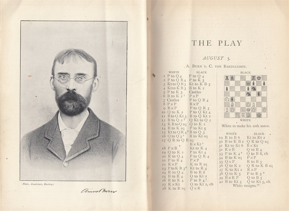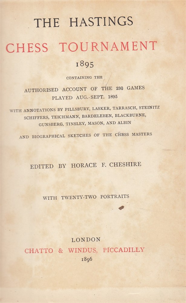 Hastings 1895. Containing the authorised Account of the 230 games played Aug.-Sept. 1895 with annotations by Pillsbury, Lasker, Tarrasch, Steinitz, Schiffers, Teichmann, Bardeleben, Blackburne, Gunsberg,Tinsley, Mason and Albin and Biographical Sketches of the Chess Masters. Edited by Horace C. Chesire. With 22 portraits.