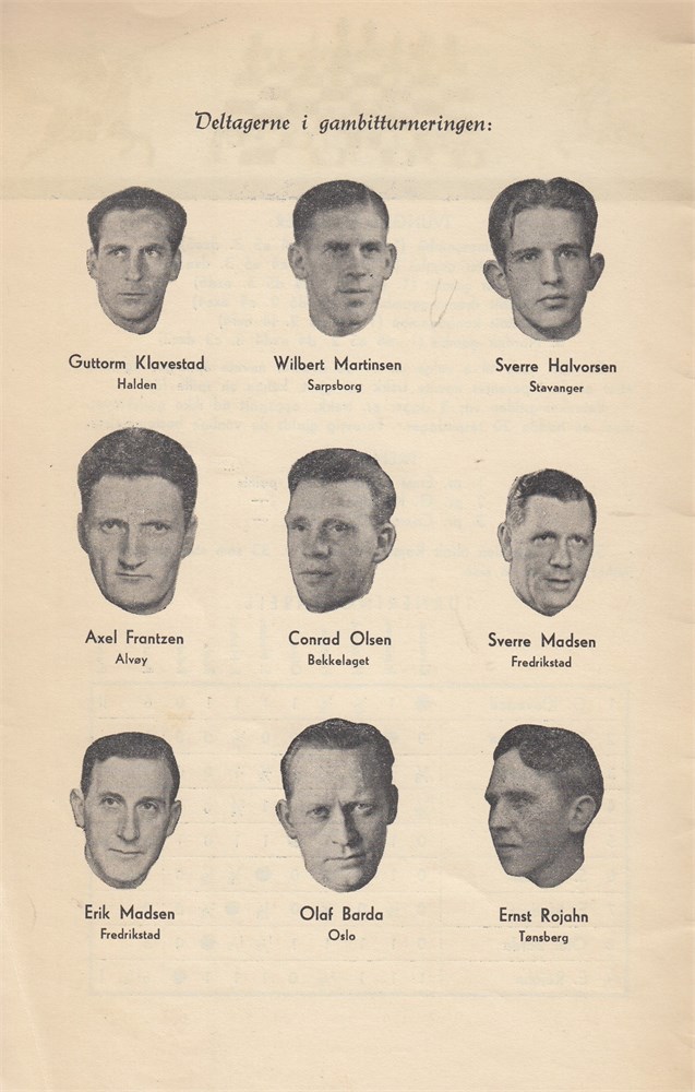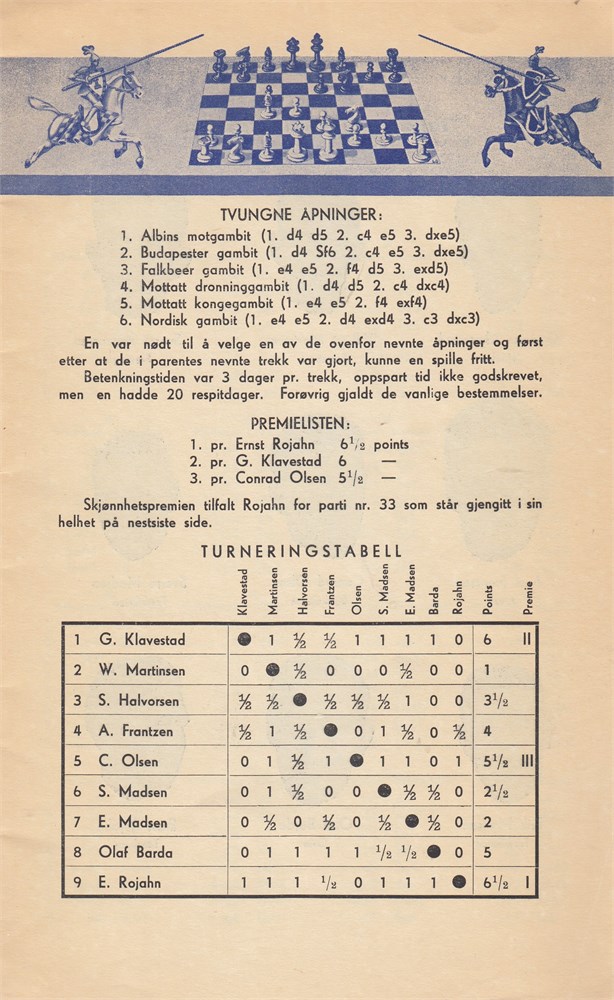 Gambit turnering 1944-45. Erik Skjaeveland took the initiative to start this gambit tournament. Suddenly he died on 2nd October 1944., about 6 weeks after the start of the tournament. , so Erik Madsen took over his games.