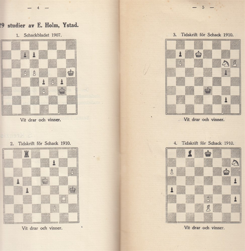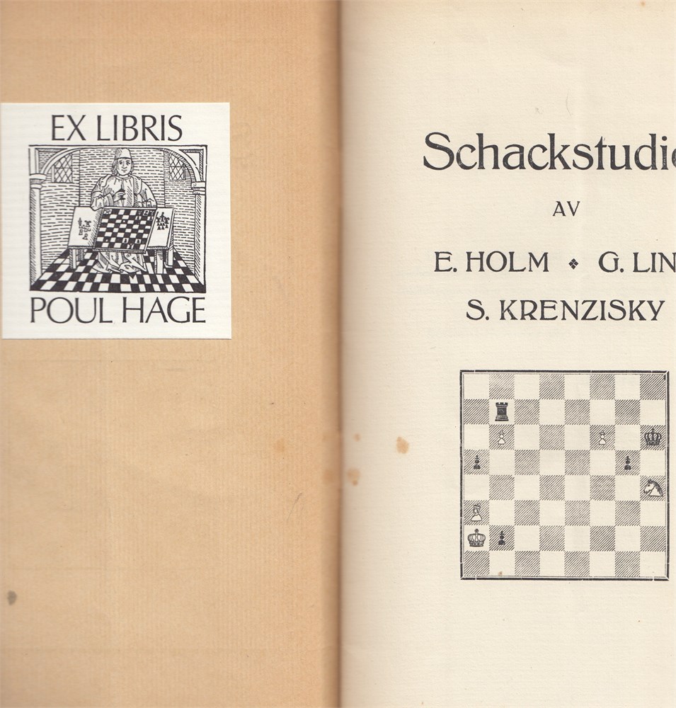 Ernst Holm, Gustaf Ling & Simon Krenzisky: Schackstudier. Exlibris Poul Hage - famous Danish player and collector. 29 studies by Ernst Holm (23.12 1879 - 1.1 1941), 12 studies by Gustaf Ling (22.4 1887 - 20.6 1952) and 8 studies by Simon Krenzisky (1.5 1893 - 8.10 1973)..