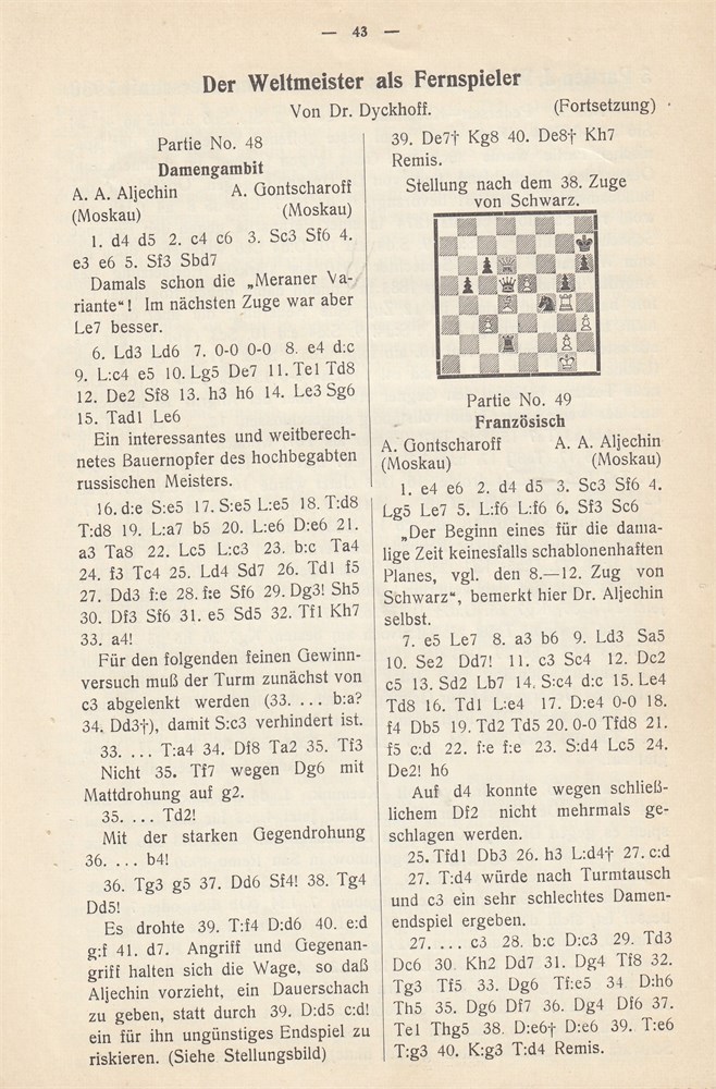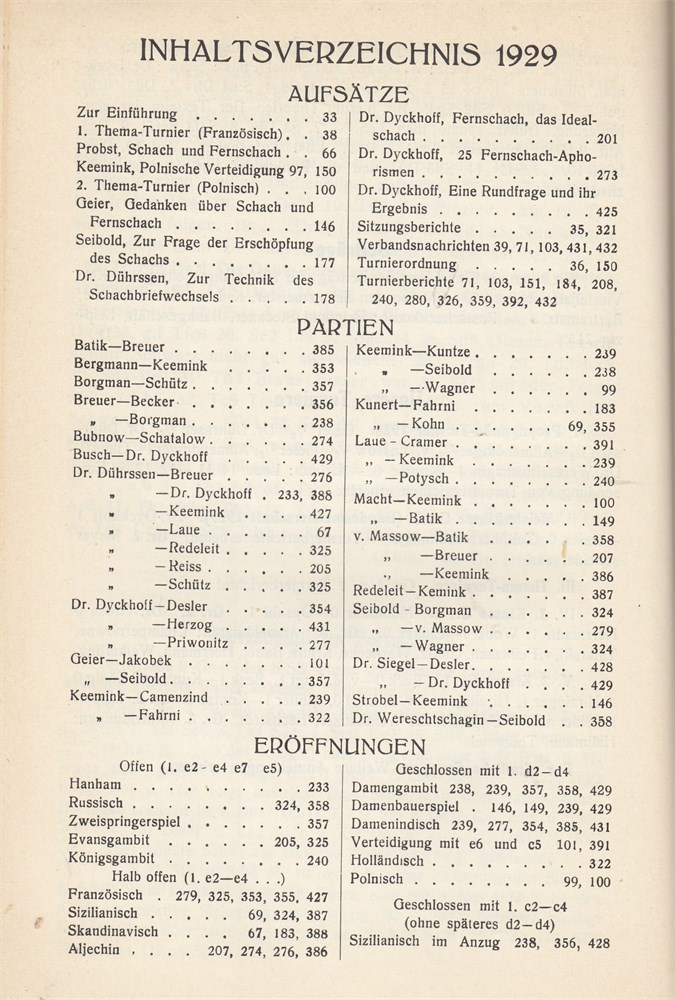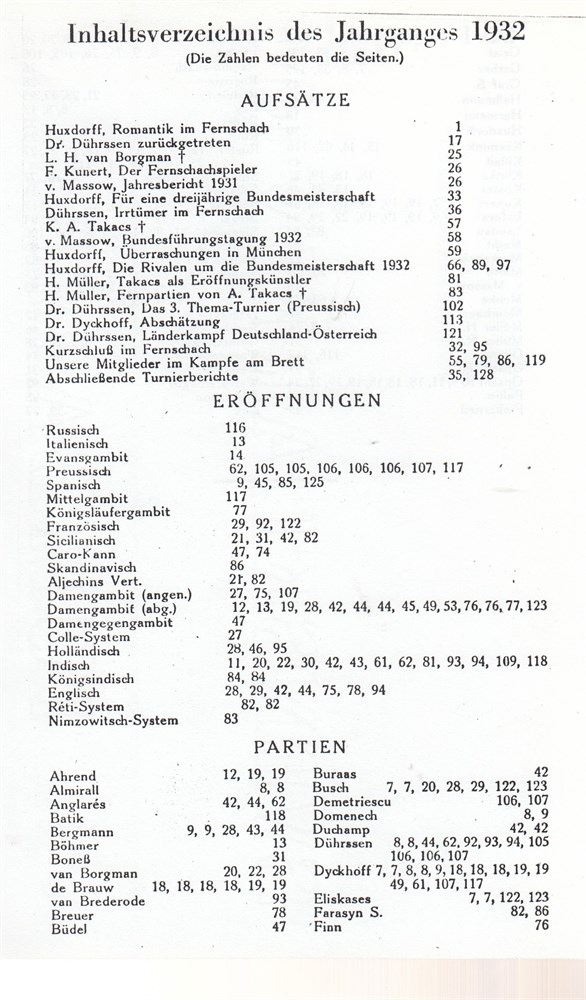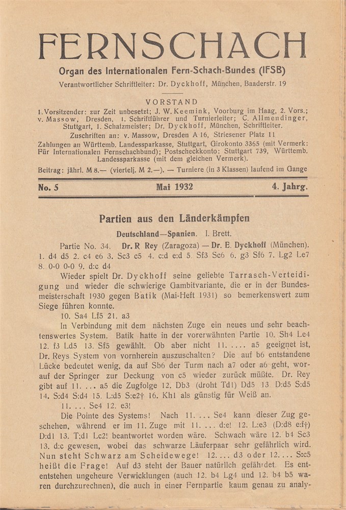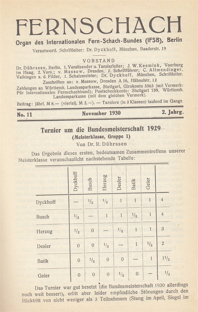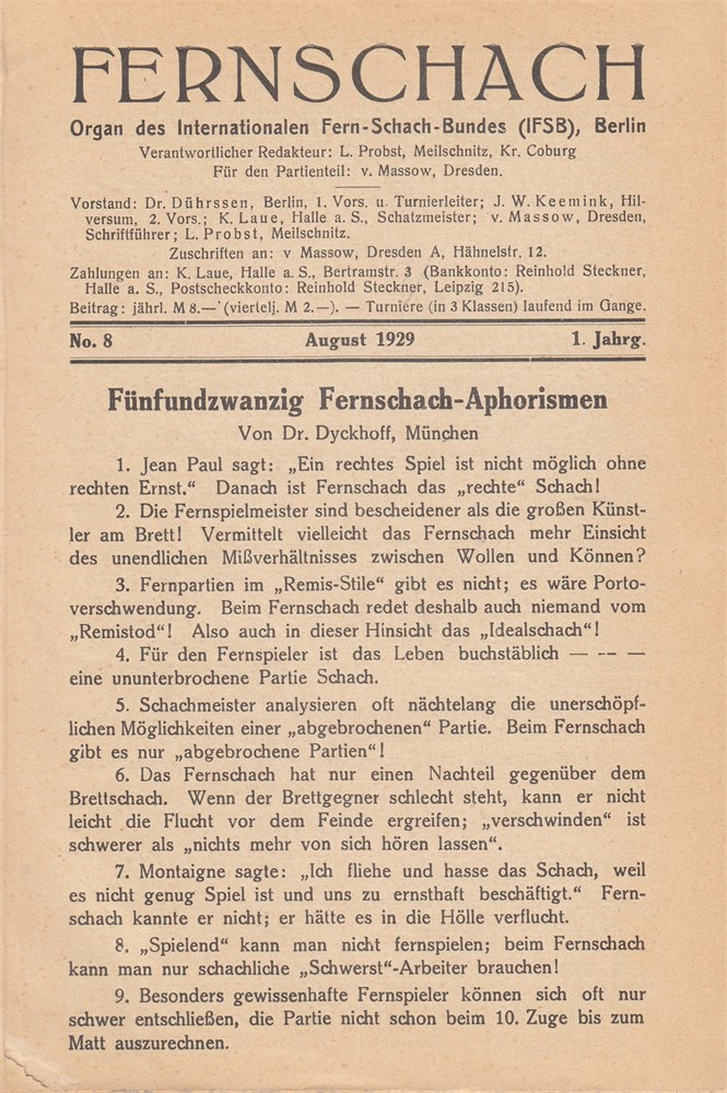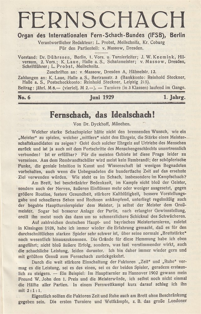Fernschach 1928-1932. First issue December 1928 "Mitteilungen des Internationalen Fern-Schach-Bundes and volume 1 was printed as an appendix to Kagans Neueste Schachnachrichten. Editors: L. Probst (1928 - Jan 1930); Dr Dührssen (Feb 1930 - Aug 1930); Dr Dyckhoff (Sep 1930-).