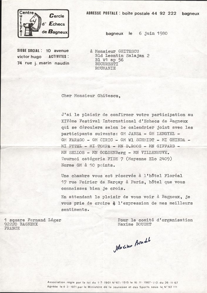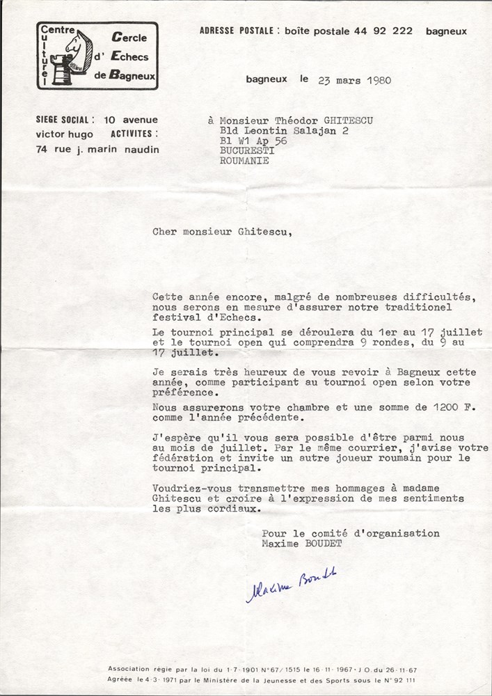 Attached are 2 letters, type-written and signed by Maxime BOUDET (from the organization committee) addressed to the Romanian GM Theodor GHITESCU (1934 - 2008). Also several annotations by Ghitescu.