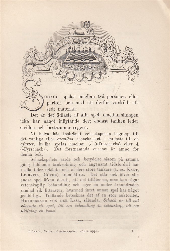 In Swedish. Johan Gustaf Schultz (23.2 1839 - 28.11 1869) was a famous publisher, problemist, columnist who also was one of the founders of the world's oldest chess club, Stockholms Chess Society.