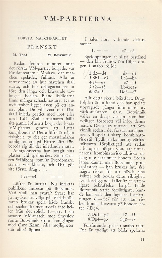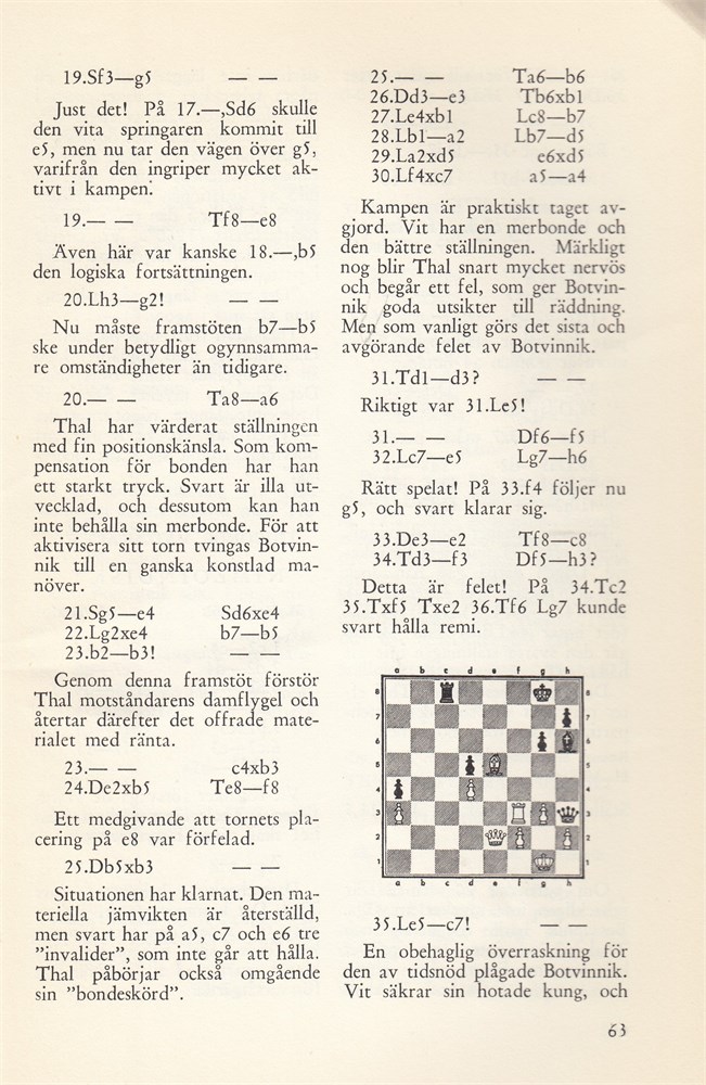 In Swedish with translated Russian annotations. All 21 annotated games from the World Championship match i Moscow 15 March - 7 May, 1960. Tal won 12½-8½ (+6 = 13 -2).