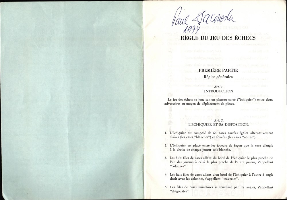 Regle du Jeu des Echecs de la F.I.D.E. ... Interpretations faites par la Commission permanente de la F.I.D.E., Federation Francaise des Echecs, ~1971, 26 pages plus paper covers. size 15x20,5 cm, in French.