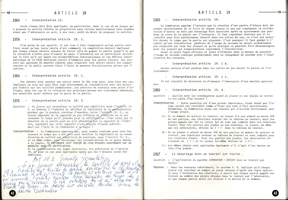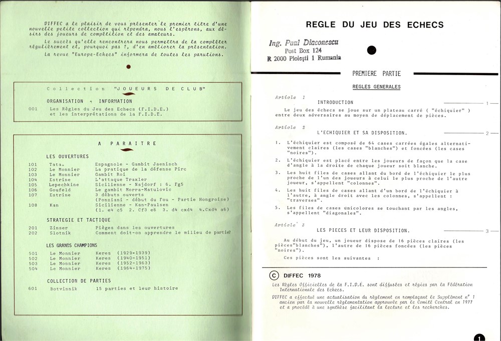 Regle du Jeu des Echecs de la Federation Internationale des Echecs. Interpretations, Diffec 1978, 56 pages, SC, size 15x21 cm, in French.