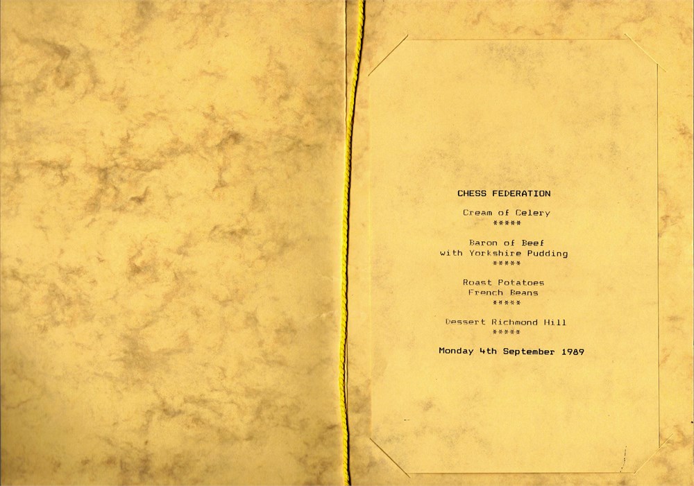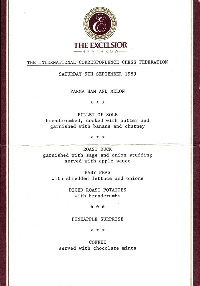 I.C.C.F. - Menus: "Banqueting Fayre", Monday 4th September 1989 at the Richmond Hill Hotel and Menu for Saturday 9th September 1989 at The Excelsior.