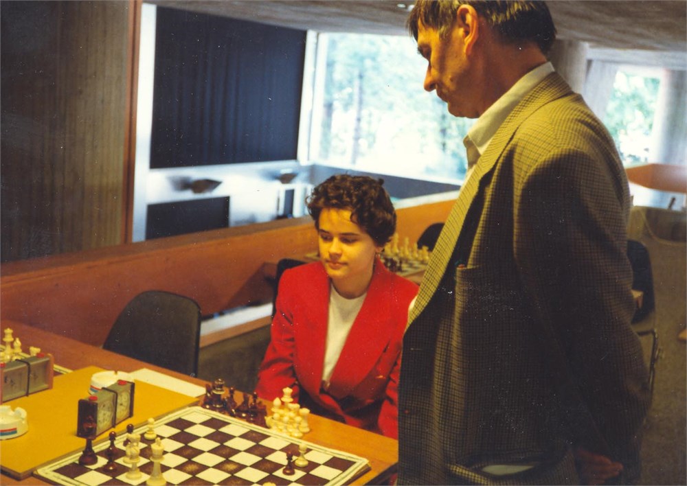 Corina PEPTAN, Romanian WGM, at the chess table in an ending at Biel tournament, viii.1996. Colored photo. Size 13x9 cm.