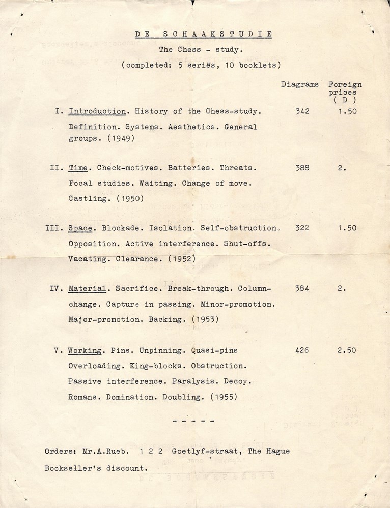 A. RUEB - An interesting document, in fact a letter from Alexander RUEB to Paul FARAGO, December 1955, a sheet A4, folded in 4. One side has the addresses, hand-written or stamped; postmark and postage stamp preserved in good condition. On opposite side, the list of prices for "De Schaakstudie" booklets. Condition: good, folded on the horizontal and vertical halves, somewhat yellowed. [SM.01.004]