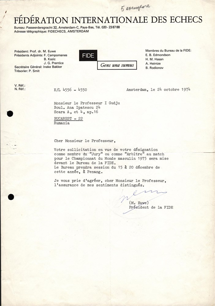 Letter with en-tete of F.I.D.E., from Max EUWE, President of F.I.D.E., to Ion GUDJU, founder member of F.I.D.E., dated "Amsterdam, le 24 octobre 1974", size A4, one side type-written and signed in original by Euwe. In French. Condition: good, perforated at left edge. [SM.01.005]