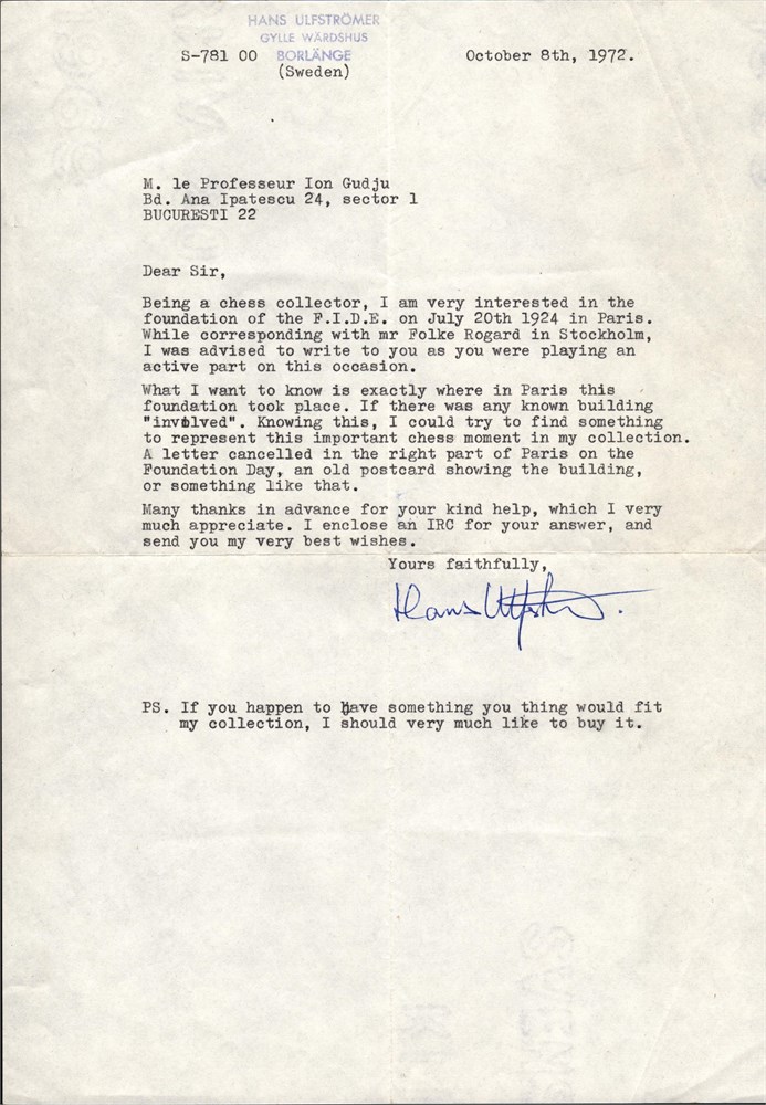 Hans ULFSTROMER, Swedish chess collector - Letter dated "October 8th, 1972" to Ion GUDJU, founder member of F.I.D.E., one side type-written, signed in original by Ulfstromer. In English. Condition: good, a little folded on the horizontal and vertical halves. [SM.01.008]