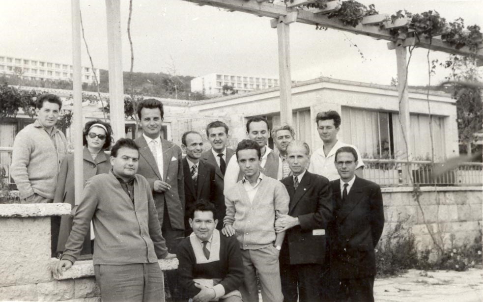 1962, Varna Olympiad (BLG). Group photo of the Romanian delegation, GM Florin GHEORGHIU and others, with Paul Diaconescu (ROU) in back. Photo small size: 8,5x5,5 cm. Condition: good. [PH.02.106]