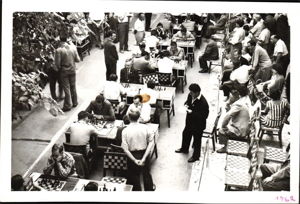 1962, Varna Olympiad - General view of the playing hall, during the round. Size 12x7,5 cm. Condition: acceptable to good; it was glued in an album, now detached/unglued, with some traces, a little folded. A small spot in center. [PH.02.118]