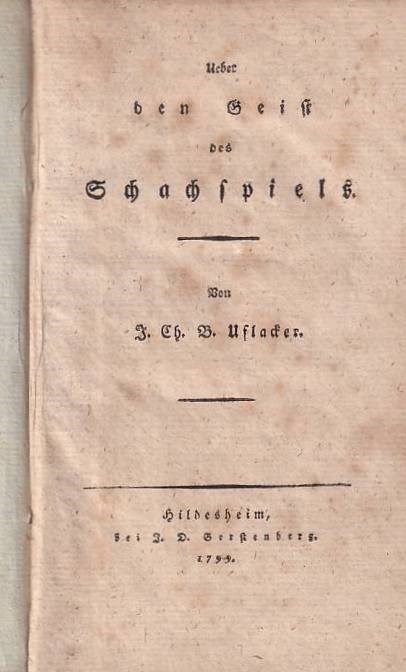 Johann Christian Bernstorf Uflacker (d. 1800) was a pastor in Ohrum. This edition contains chapters on the nature, history, and mechanics (rules and moves of the pieces) of chess, as well as on chess theory. At the end is a practical appendix, which includes, among other things, a sample game by Gustavus Selenus and an endgame by Stamma. From page 25 onward, there is also a short article about the village of Ströbeck.