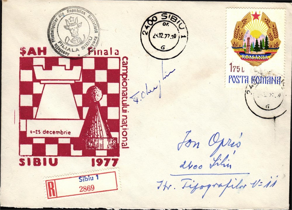 Finala Campionatului național de șah (= National Championship, men), București, 01-23.xii.1977. Envelope signed by GM Florin GHEORGHIU. Philatelic stamp, postage stamp and postmark. Condition: good to very good. [PC.02.018 A]