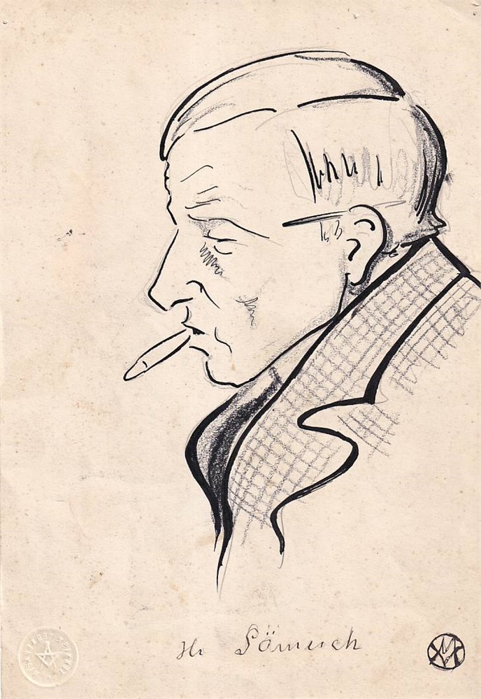 Five caricatures from the tournament by the prominent Politiken cartoonist Valdemar Møller. The ‘VW’ monogram corresponds to Møller, who often used a stylized signature. He served as a staff cartoonist at Politiken from 1920 to 1947, and the clean, economical line and profile caricatures are characteristic of his work.