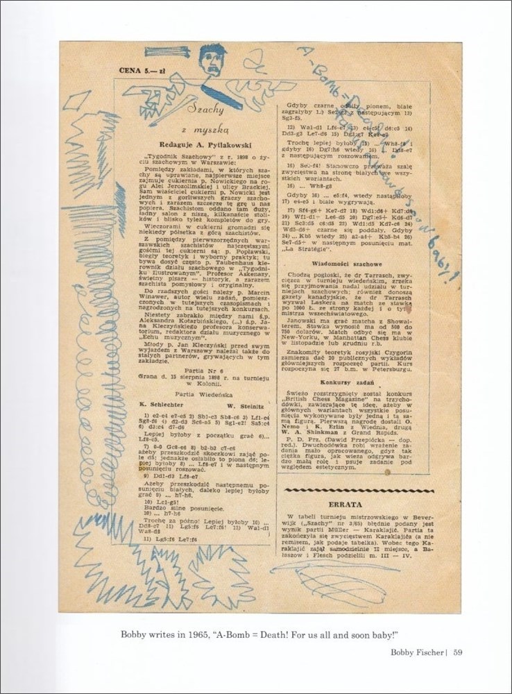 Bobby Fischer Triumph and Despair. Pictorial account of all sorts of Fischer items, accumulated over the years by the author. This monumental work is an extension of Bobby Fischer Uncensored, including a complete 1999 diary written in Fischer's hand (300+ pages), 8 Fischer annotated games from Herceg Novi 1970, 7 unrecorded training games (1992) between Fischer and Gligoric (6) and Torre (1), over 100 pages of correspondence between Fischer and Gligoric from 1973-1995, the Ed Edmondson notes from the early to mid-1970's regarding Fischer telephone conversations, a 62-page typescript by Fischer elaborating the differences between the Batsford and Simon & Schuster editions of 'My 60 Memorable Games', 2 letters written by Fischer to the U.S. consulate while incarcerated in the detention center in Japan and other letters and memorabilia of Fischer. Foreword by Alessandra De Lucia. Epilogue and bibliography. Bound hardcover in solid black slip case. 786 p. 28 cm x 23,5 cm. Private edition - Darien, CT, 2009.