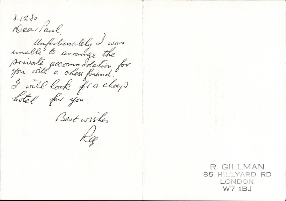 Chess-themed Christmas card, hand-written and signed by R. GILLMAN. Condition: very good. [PC.02.070]