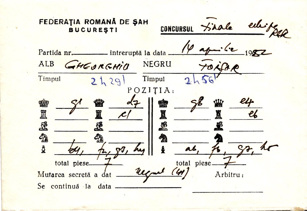 Pre-printed envelope for adjourned games for Federația Română de Șah. The envelope was used in the game Gheorghiu - Foișor during the National Team Championship, 14.04.1982. There are mentioned the positions, the time, other information. All the text is written by GM Florin Gheorghiu. Signed on opposite side by IM Ovidiu Foișor. Condition: good. [PC.02.075]