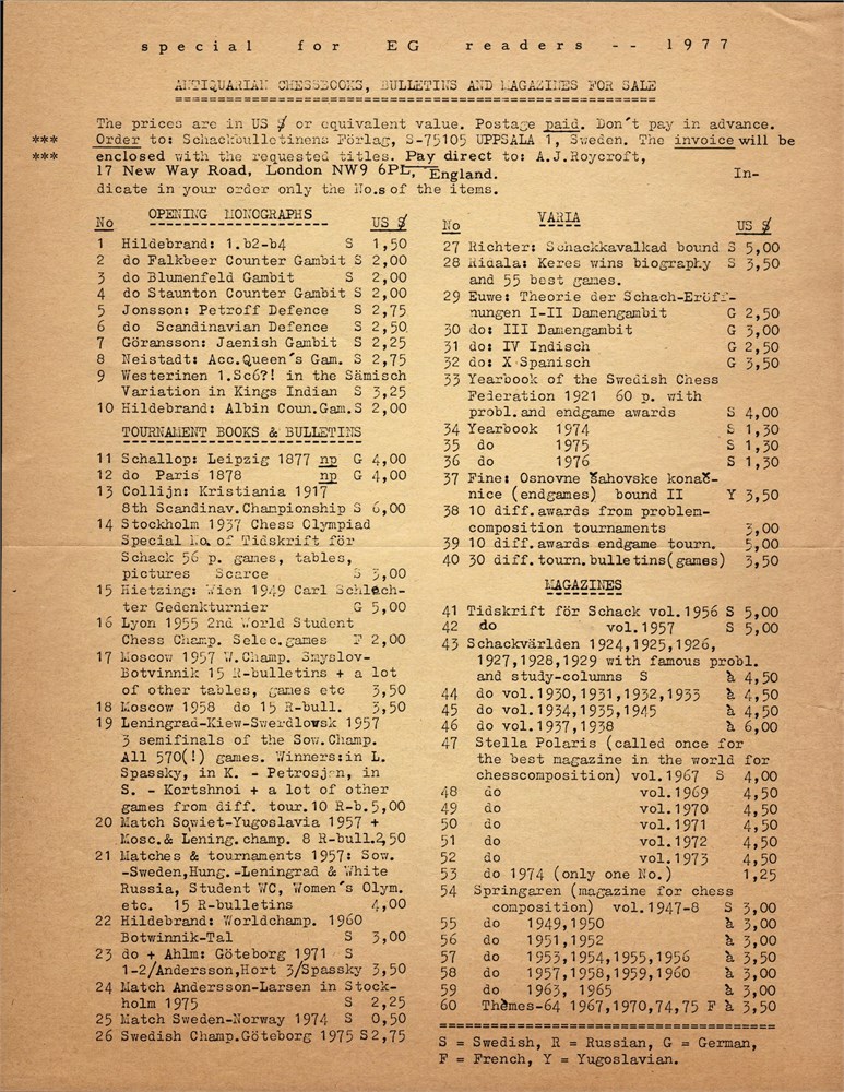 "Antiquarian chess books, bulletins and magazines for sale", "special for EG readers - 1977", one page 20,5x26,5 cm, type-written sigle side. Condition: good, slightly folded at edges. [DO.01.007]