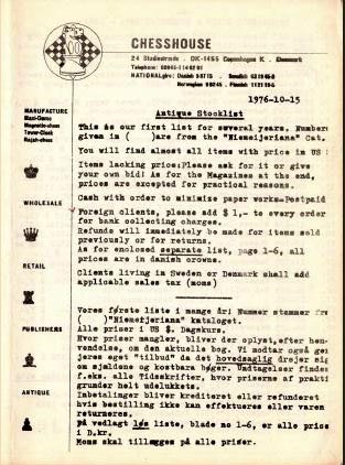 "Chess House", Copenhagen, 15.10.1976. 27 pag. A5, in fact 7 sheets A4 type-written both sides and folded on vertical half. Complete. Editor: Stellan Persson. Condition: good to very good. [DO.01.009]