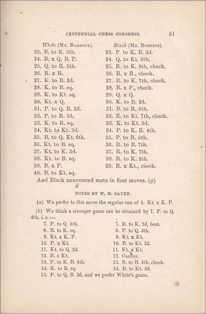 Philadelphia 1876. The Grand International Centennial Chess Congress, held ... in August, 1876. During the celebration of the American centennial. All 60 games from the tournament, annotated by Jacob Elson, B. M. Neill, and W. H. Sayen. No diagrams. Descriptive notation. Cross table. History of the tournament. Mason won in front of Judd. XIX, pp. 25 - 199. 19 cm. Original linen witn embossed patern on front cover and gilt print on spine. Philadelphia, Claxton, Remsen and Hasselfinger, 1876. L/N 5203. Betts 25 - 11.