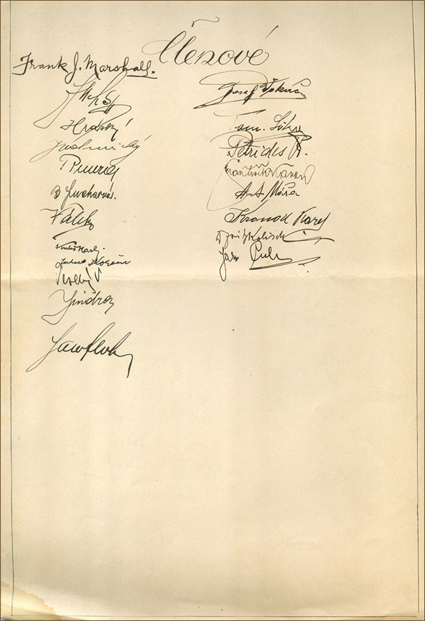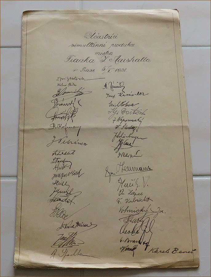 Frank J. Marshall - Record of a simultaneous exhibition held in Prague on October 5, 1928. Signed by Frank Marshall (twice) and many others.