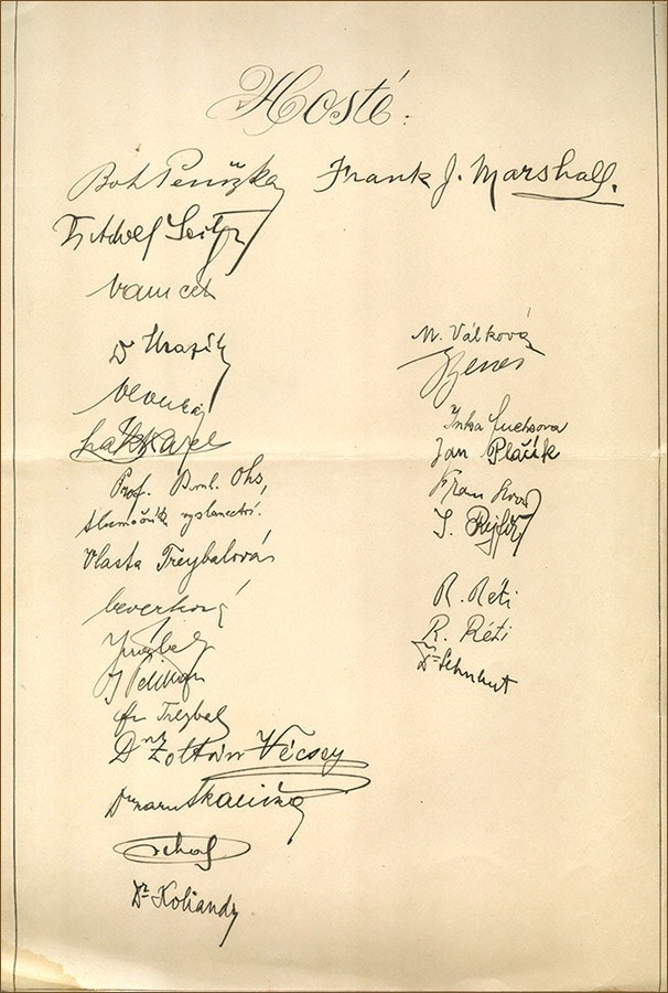 The third sheet is titled Hoste (Guests). It is signed by 27 persons, including Bohumil Penizka, Dr. Adolf Seitz, Dr. Mrazik, J. Pelikan, Frantisek Treybal, Dr. Zoltan Vecsey, Dr. Karel Skalicka, Dr. Koliandr, and in the right column: Frank Marshall, Josef Rejfir, Richard Reti, Rudolf Reti, and others.