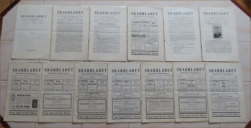 Dansk Skak Union 1928. Loose issues 1-4, special issue, 6-12. (4) = title, index + 184 + 54 pages. Size ca 25 cm. Weight 400 grams. LN 6001. In Danish.