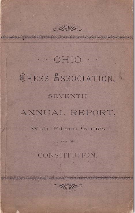 Seventh Annual Report, with fifteen Games from the championship tournament. Descriptive notation. No diagrams. Constitution is four pages. 28 pages in total. Pamphlet. Sewed.