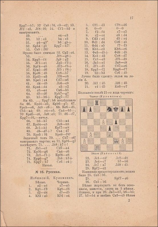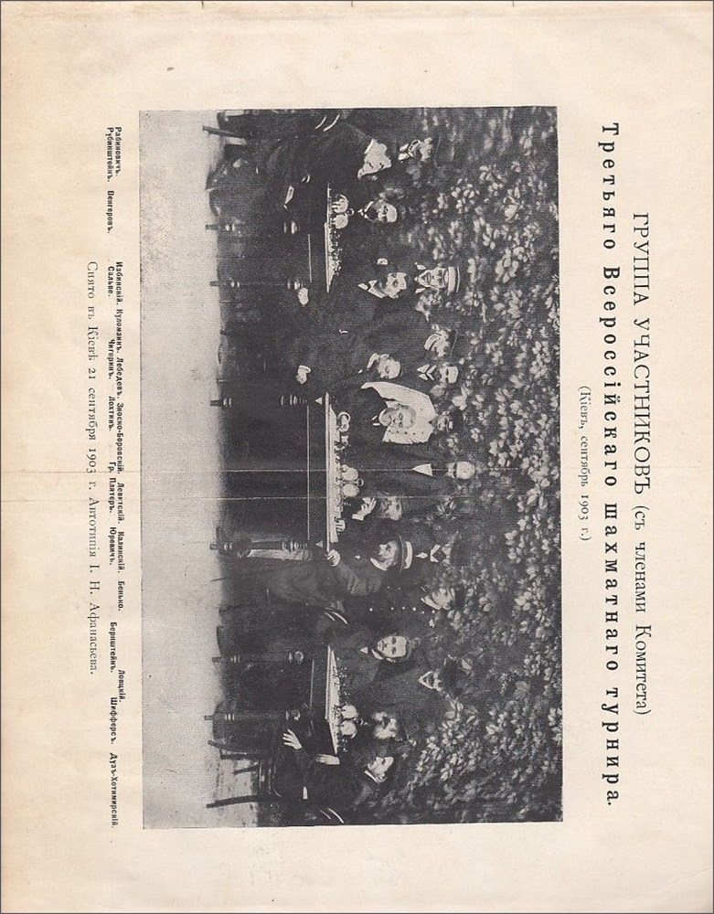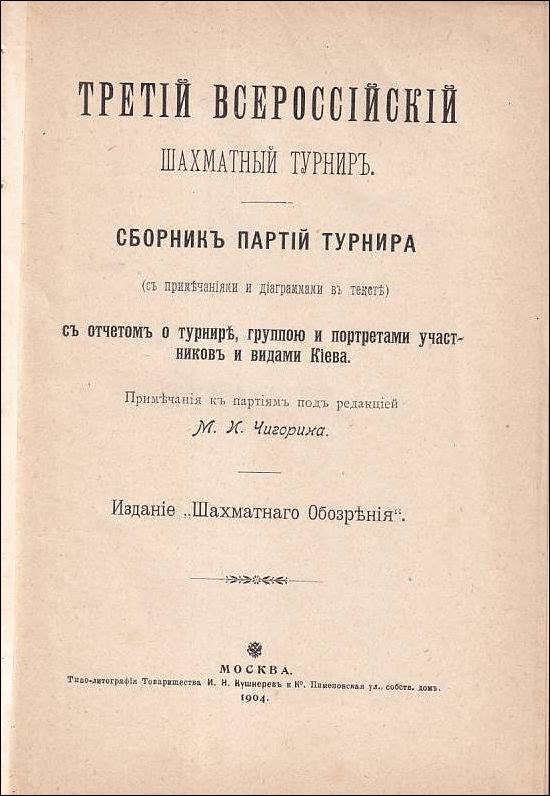Chigorin. Kiev 1903. Tretiy vserossiyskiy shakhmatnyy turnir. Sbornik partiy turnira. Third Russian national chess tournament Kiev 1903. With a group photo on one folded plate. 9 photos in text. All 163 games from the tournament with annotations in Russian. Many diagrams. Russian notation. Cross table. Opening index. Table of content. Round-by-round reports. Chigorin won in front of Bernstein. XII, 151 pages. 20 cm. Paperback with thin cardboards. Moscow, Schachmatnago Obosrenija, 1904. L/N 5261. Sakharov 74.