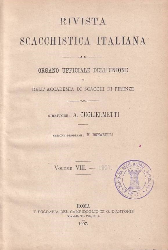 Rivista Scacchistica Italiana 1907. Organo Ufficiale dell'Unione dell'Accademia di Scacchi di Firenze. Monthly. In Italian. Editor: Augusto Guglielmetti. Volume 8. LN 6185. Sanvito 903. Di Felice 2013.