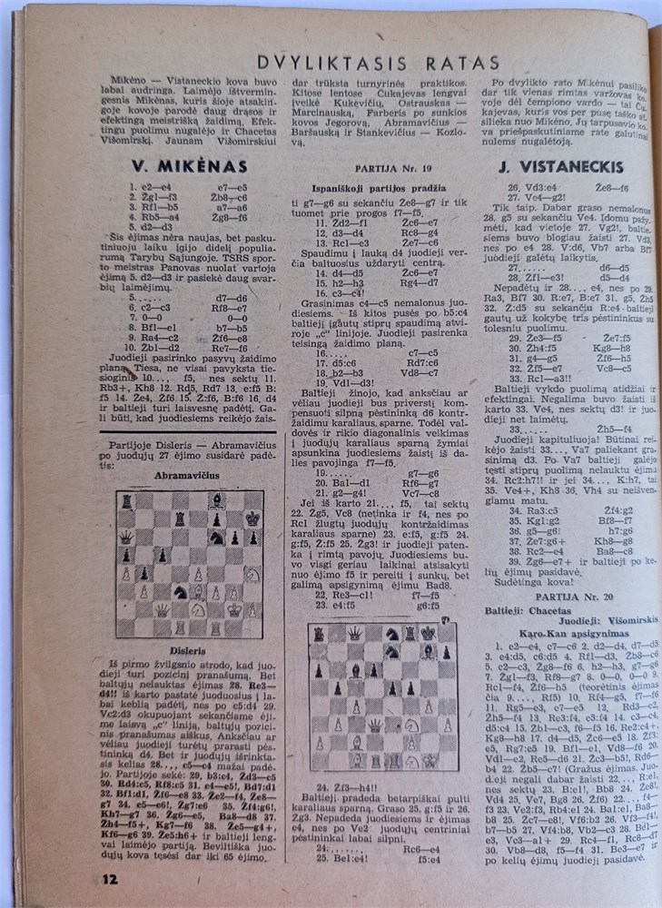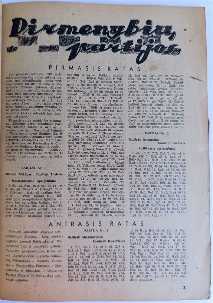 Mikenas, Vladas. Lietuvos TSR 1948 m. sachmatu pirmenybiu biuletenis. Kūno Kulturos ir Sporto Komiteto prie LTSR Ministrų Tarybos vienkartinis biuletenis. Vilnius, 1948. In Lithuanian. 19, [1] pages. Not in LN. Di Felice 2275.1.