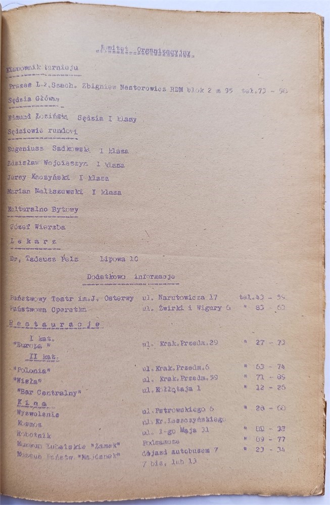 Polfinal Szachowych Mistrzostw Polski Seniorow na rok 1961/62. Biuletyn Lubelskiego Okregowego Zwiazku Szachowego w Lublinie. In Polish. 5 leaves, 32 pages, 1 leaf. Di Felice 1189.1.