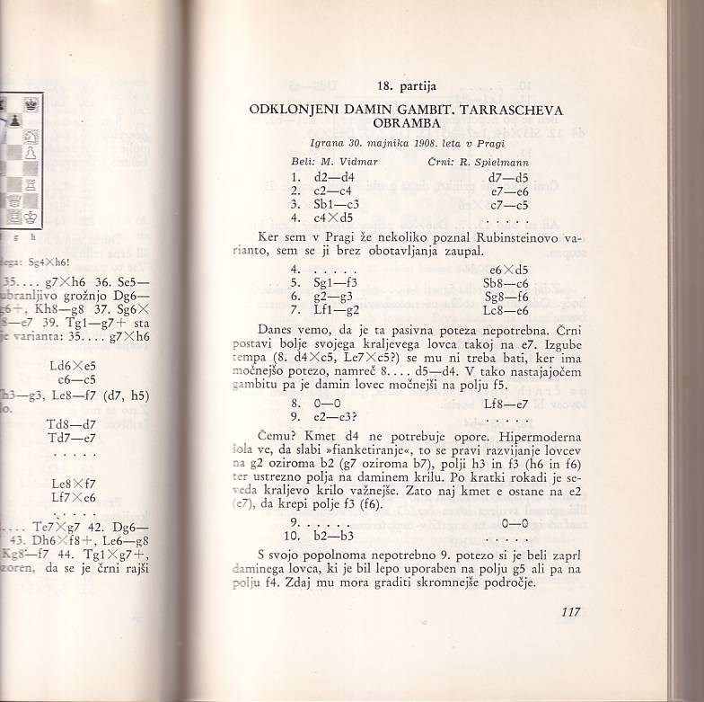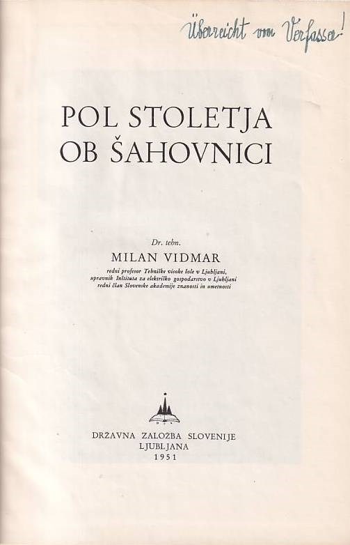 Vidmar, Milan. Pol stoletja ob sahovnici. Half a century at the chessboard. With 12 plates, 1 folded table, and numerous diagrams. 637 pages, 5 leaves. Original binding. This edition contains 100 annotated sections and autobiographical notes. Ljubljana, Drzavna Zalozba Slovenije, 1951. L/N 3356. Chicco / Porreca, p. 564.